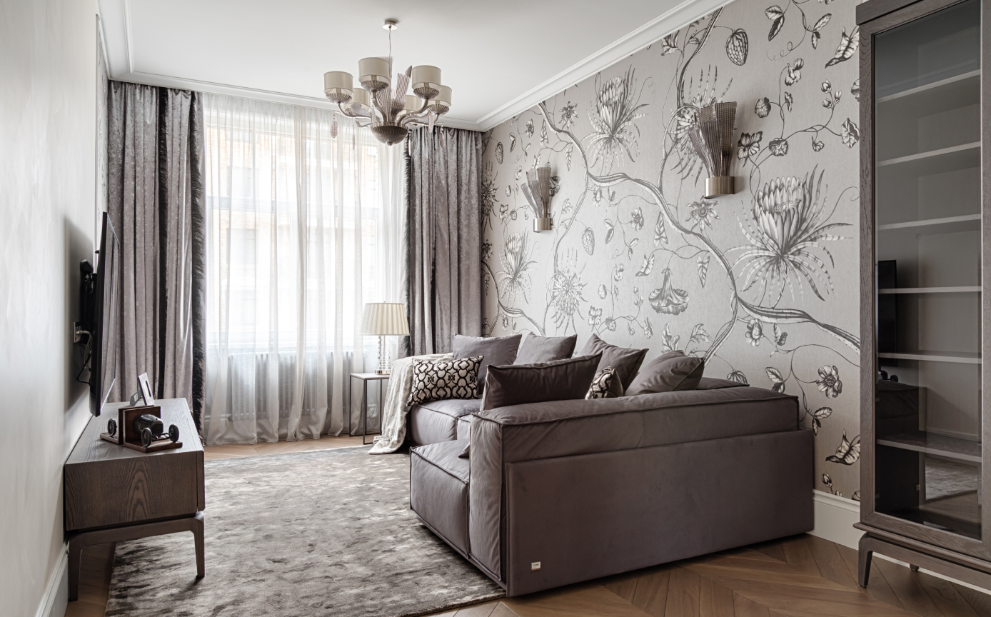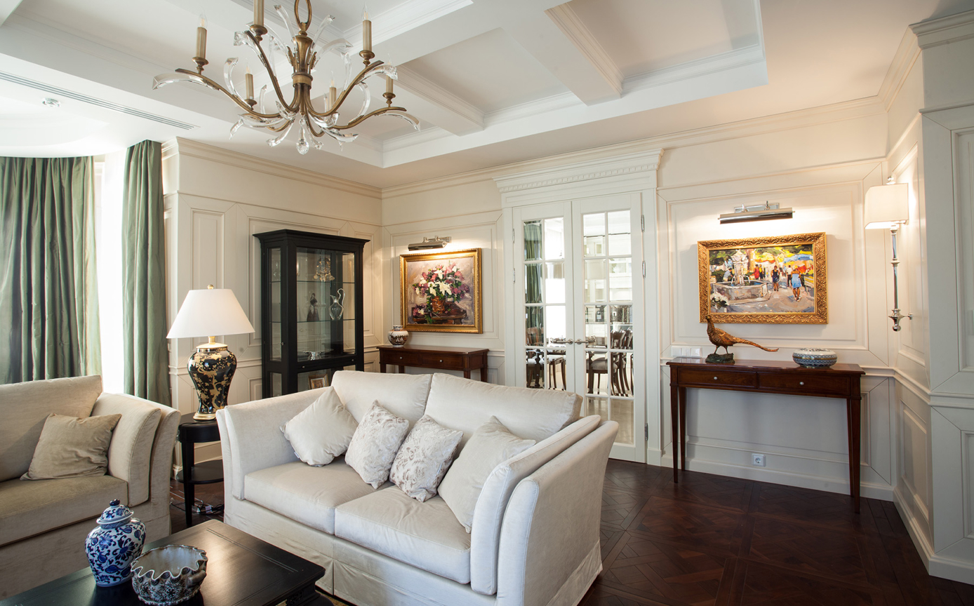 Оформление стен стеновыми панелями из МДФ, зеркал и мягких вставок. Двери, перегородки с подетальной окраской. Классическая кухня, мебель для детской, кабинета.