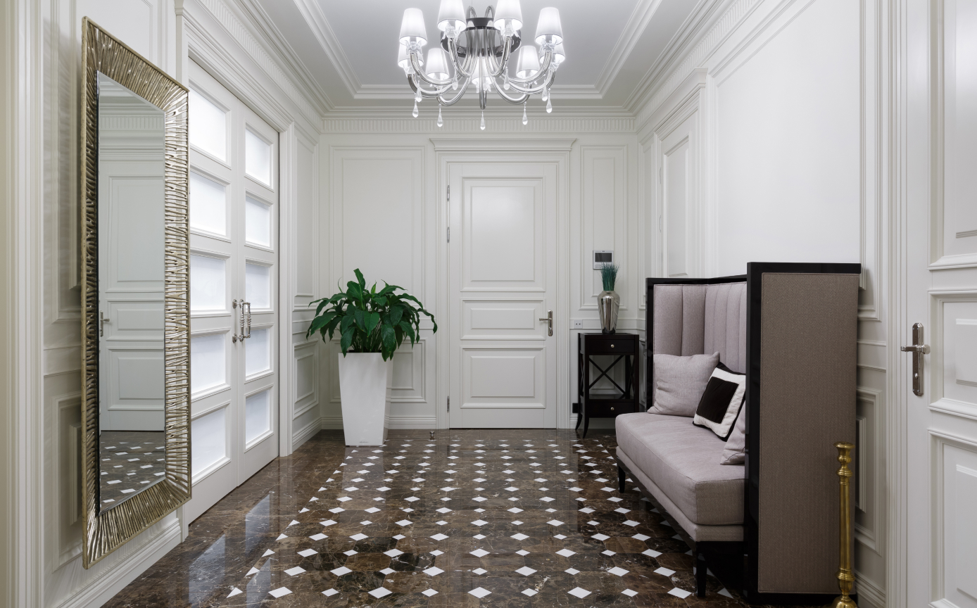 Уличные и внутренние двери, с фацетированными стеклопакетами и латунными рамками ручной работы. Зона холла с латунной зонтичницей, ящиком для писем, стойкой консьержа и колоннами.